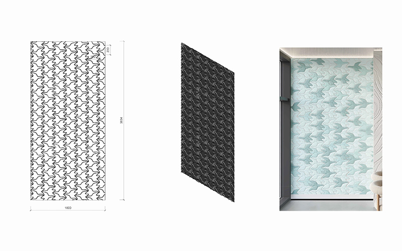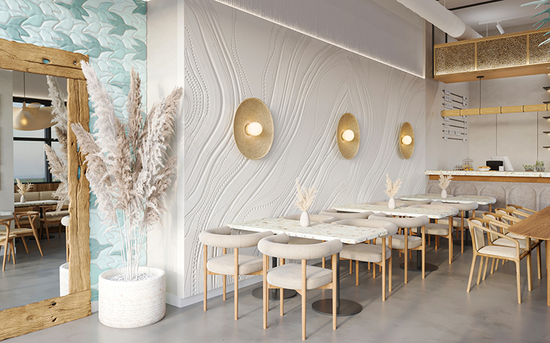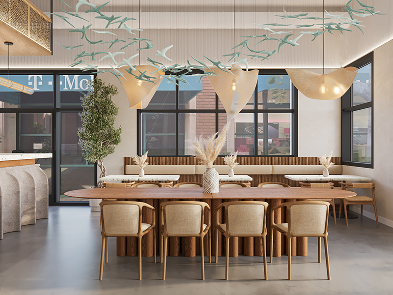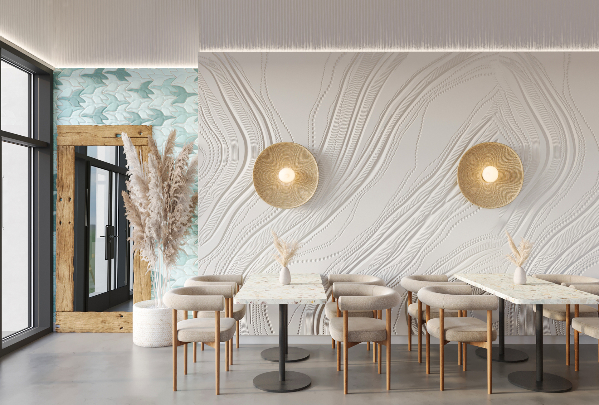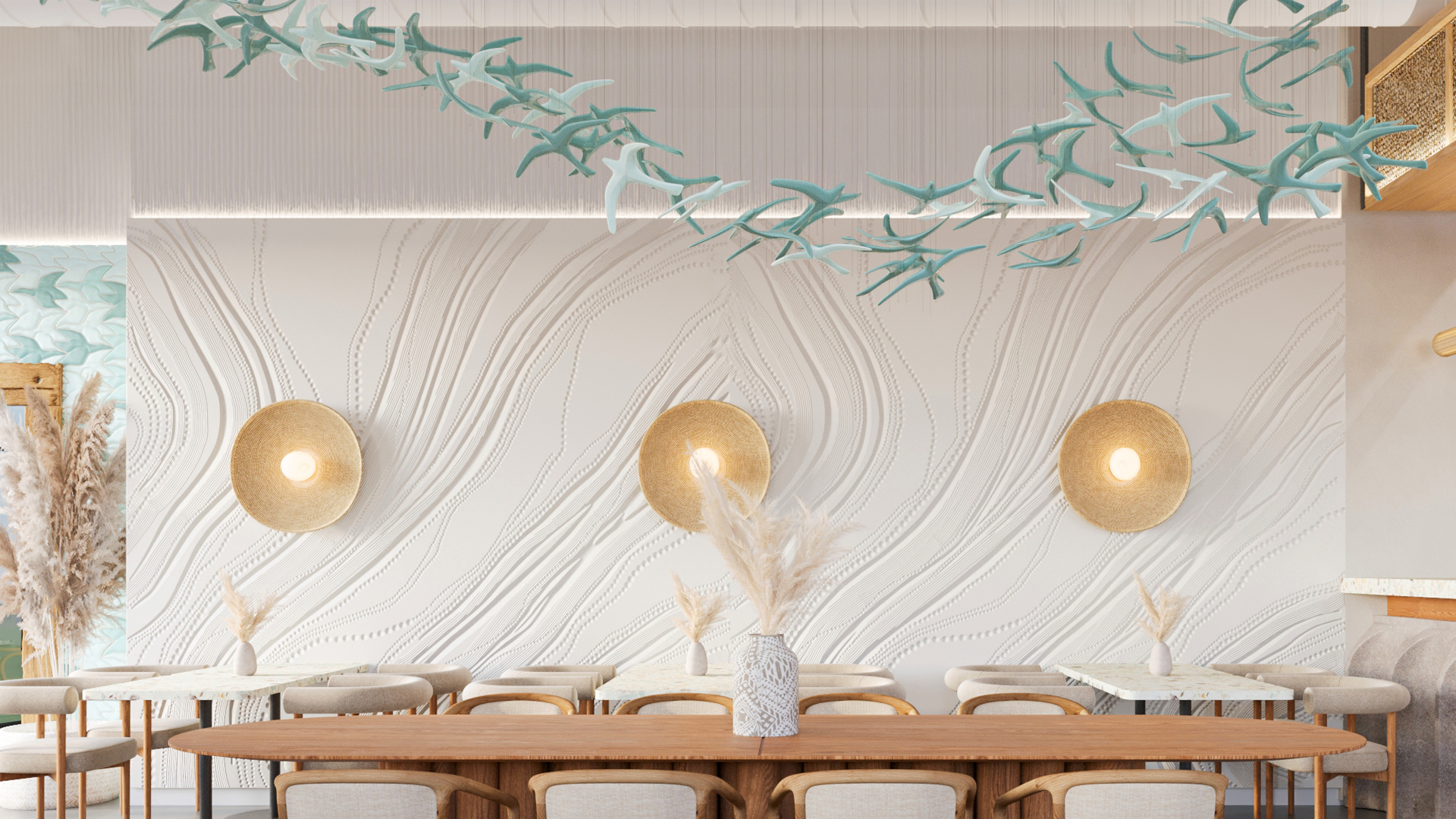 A flock of sculptural, blue-green birds sweeps across the ceiling, setting a lyrical tone that’s echoed in every curve from the woven pendant lights to the flow of textured white walls.