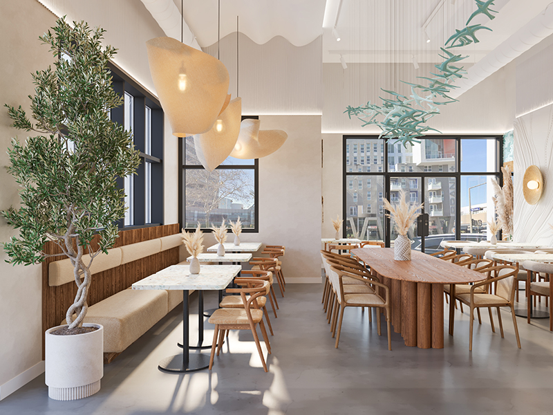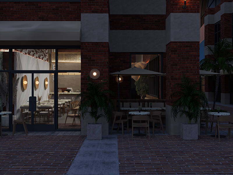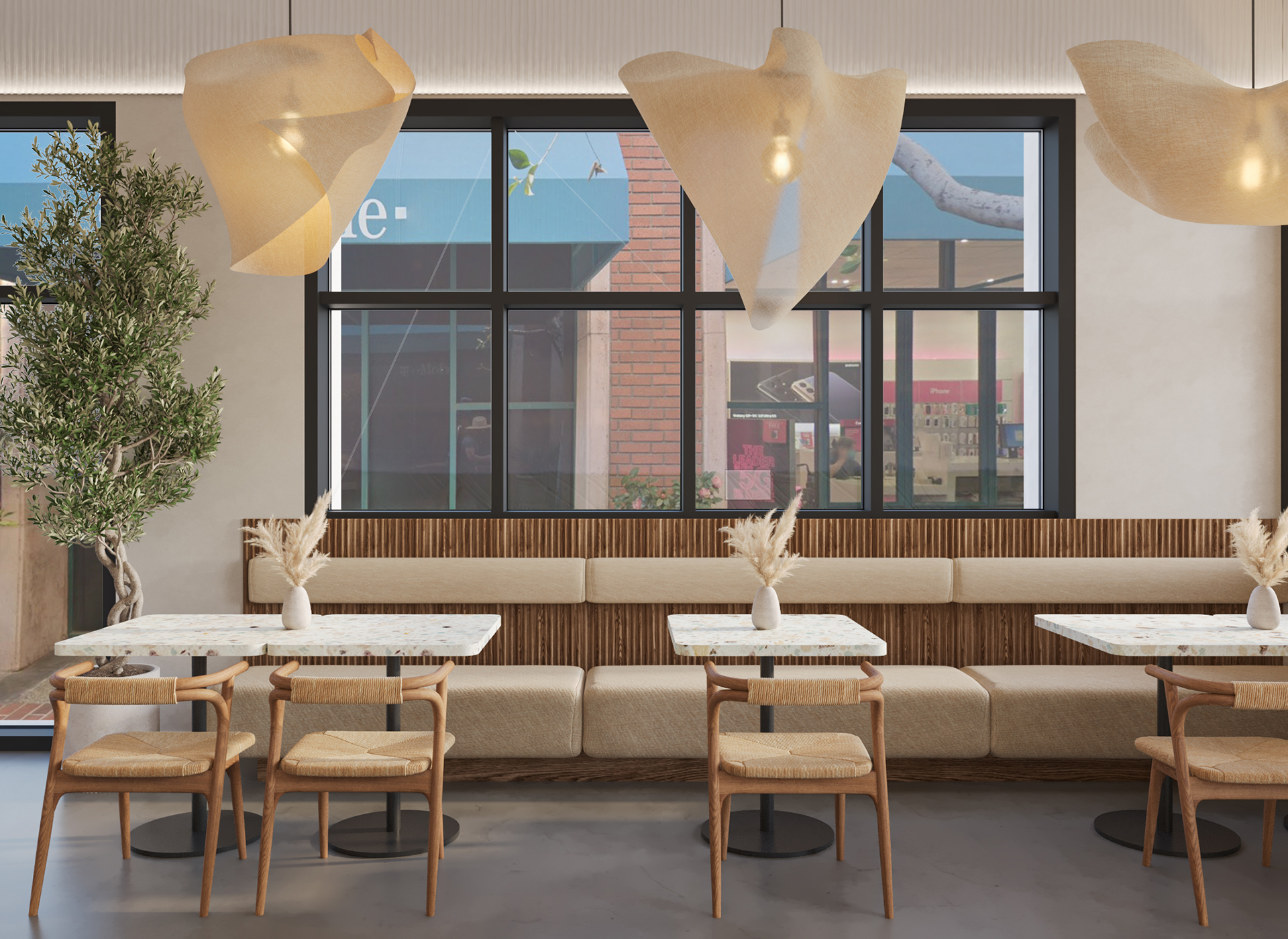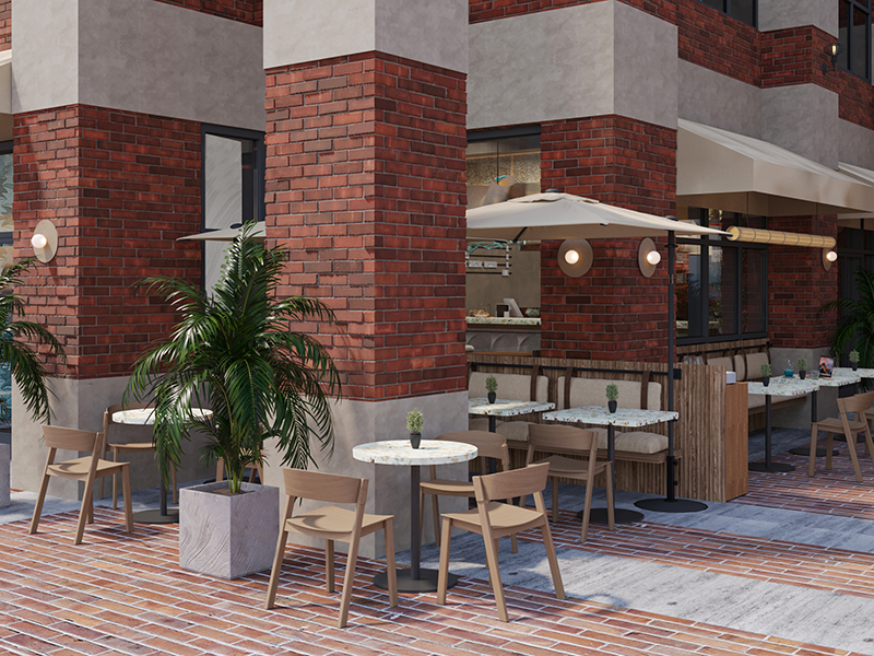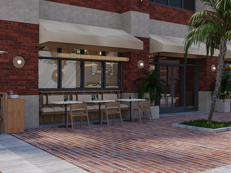 The façade continues this harmony. Set within a bold, urban red-brick structure, the sidewalk-level terrace seating extends the experience outdoors, making the café feel open, approachable, and perfectly at home in the cityscape.