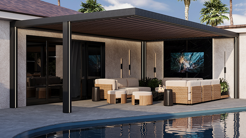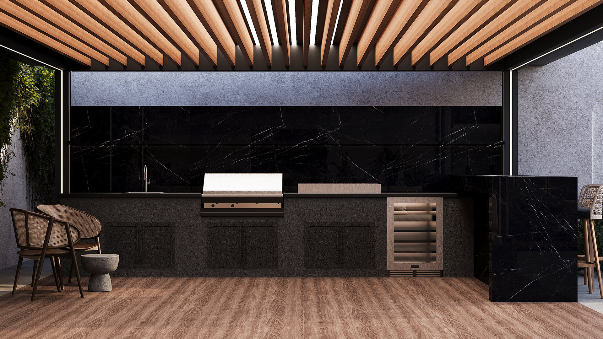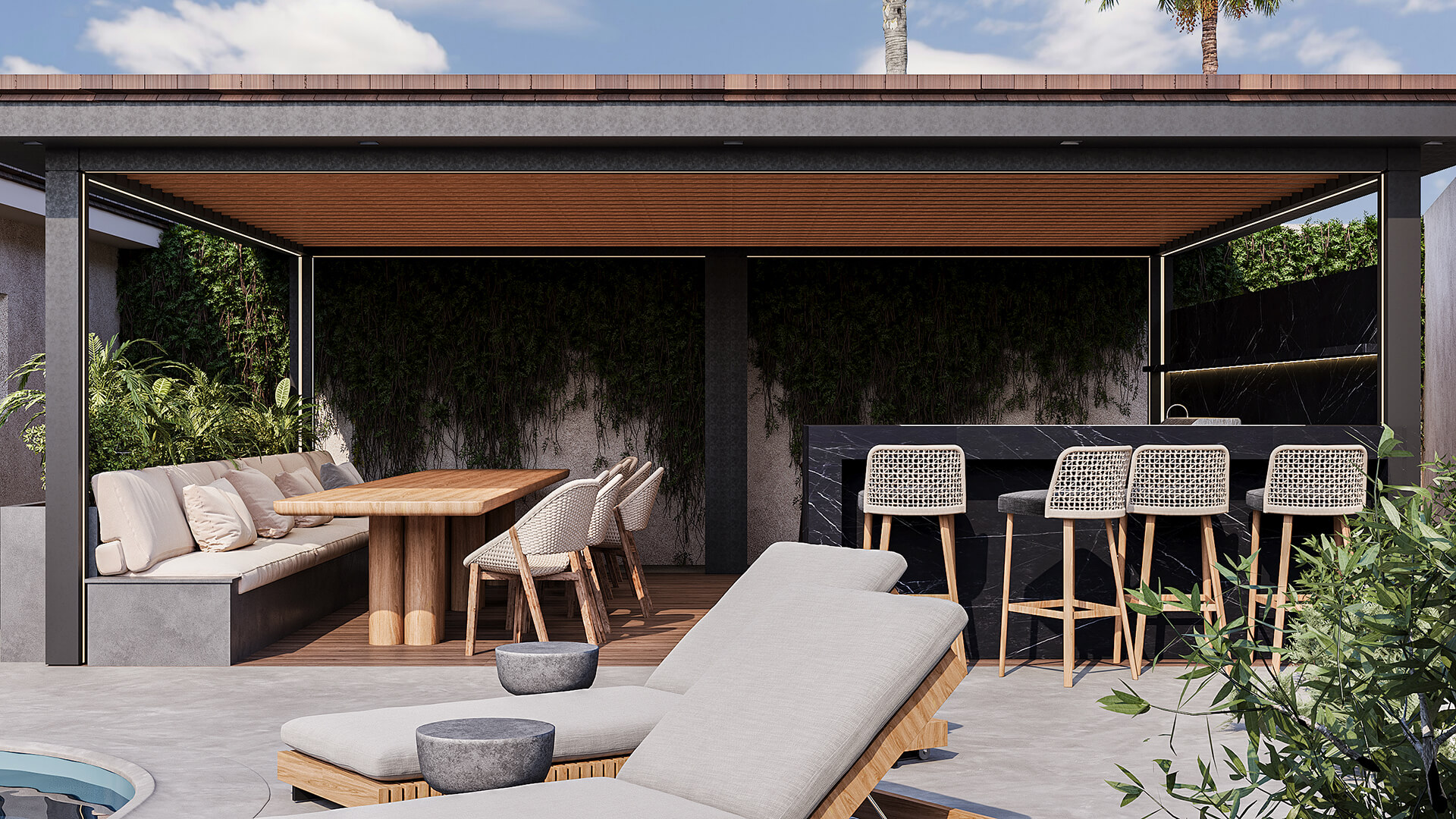 An outdoor kitchen adds a touch of functionality, allowing for effortless hosting and alfresco dining.