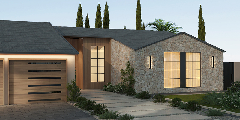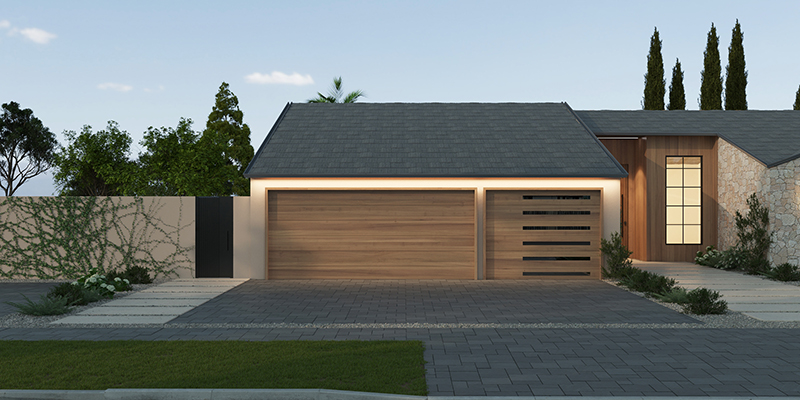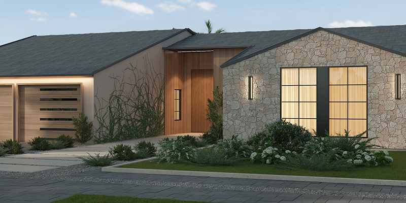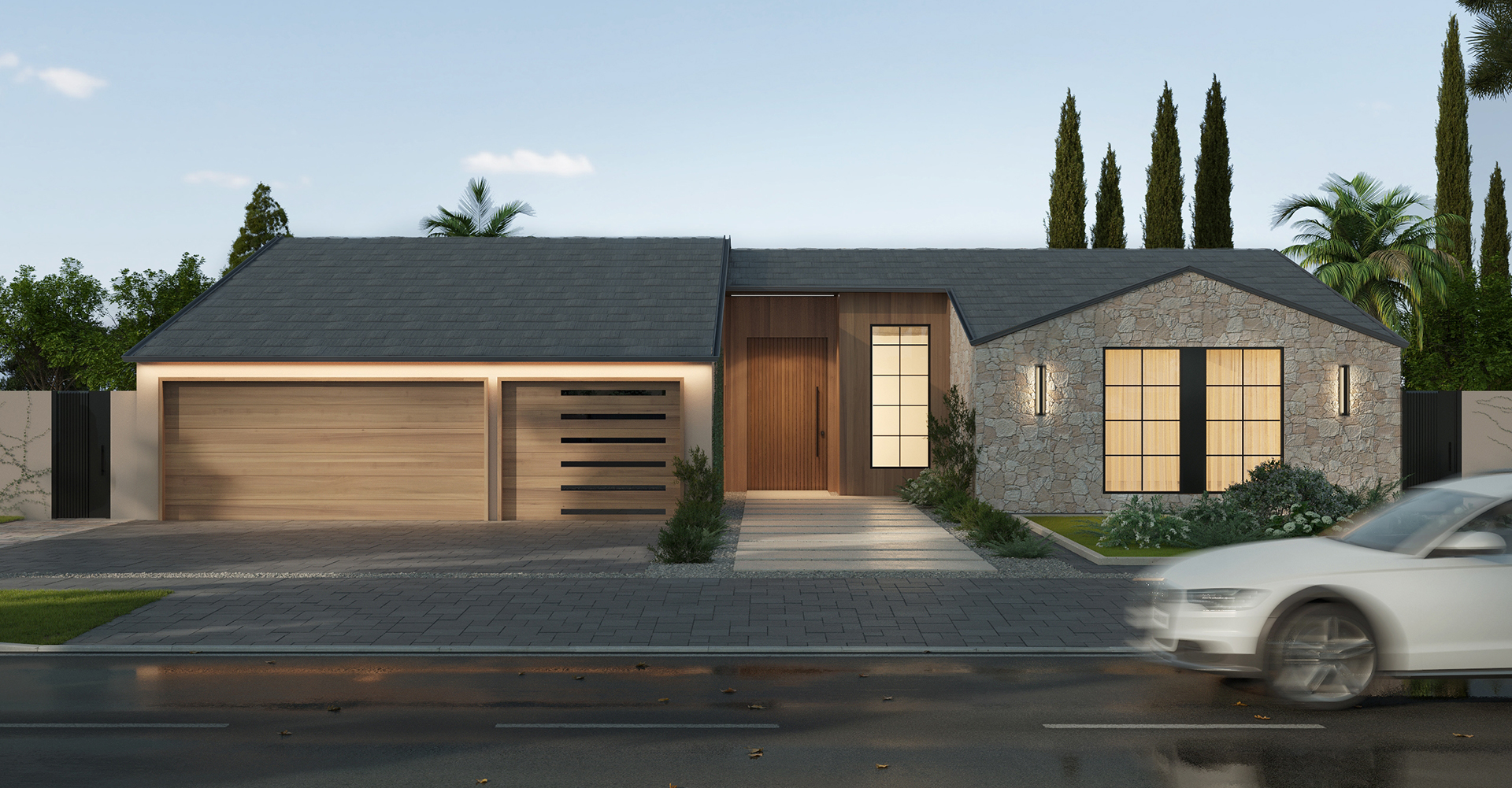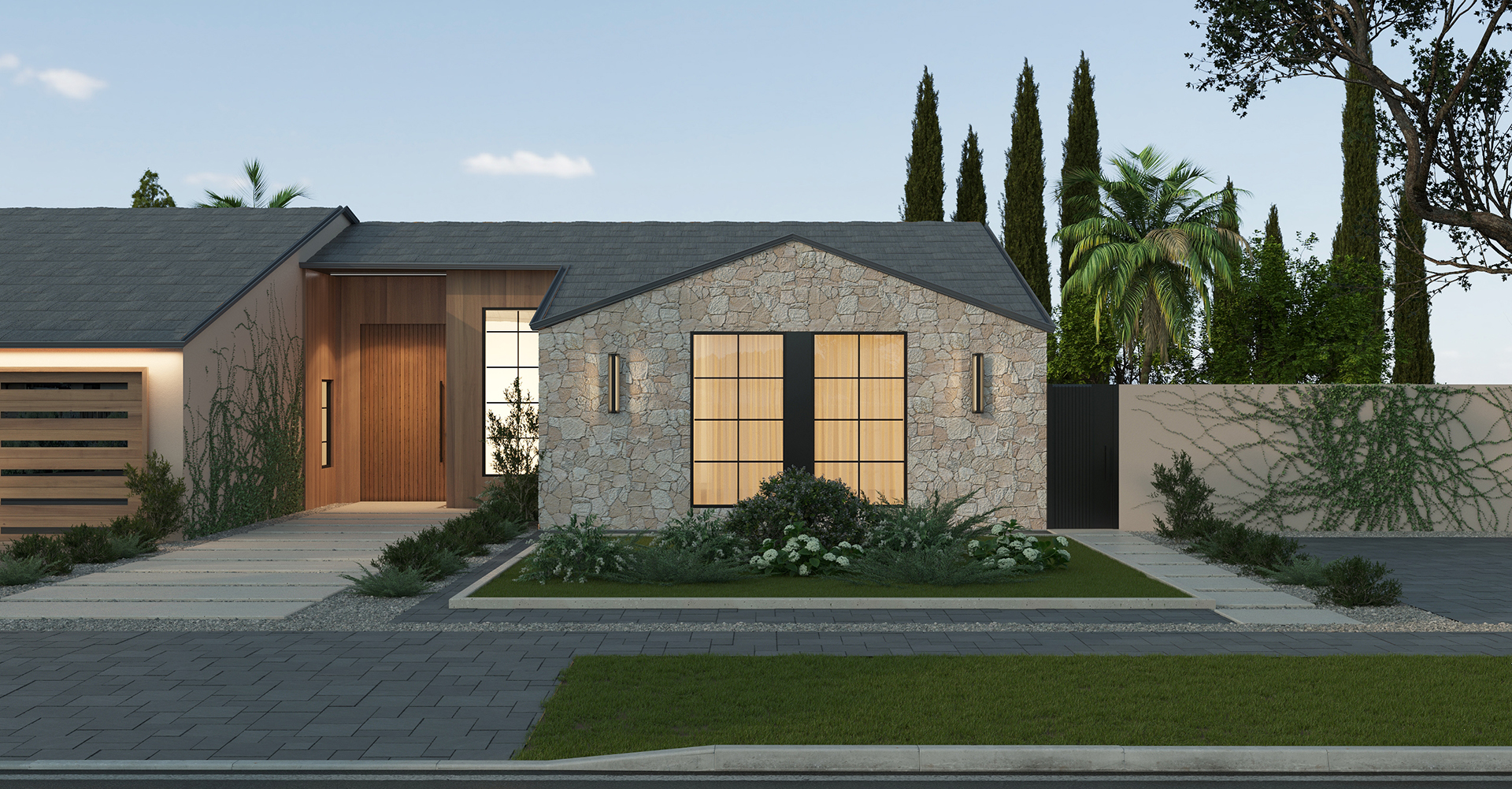 The facade of this project blends clean lines with a refined material palette. Light, textured stone contrasts beautifully with warm vertical wood panels and dark accents, creating a modern yet welcoming presence. Subtle ambient lighting accentuates the architectural forms and textures, drawing the eye toward the recessed entrance.