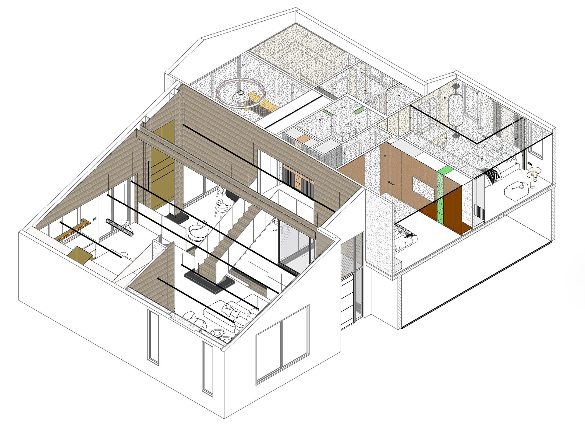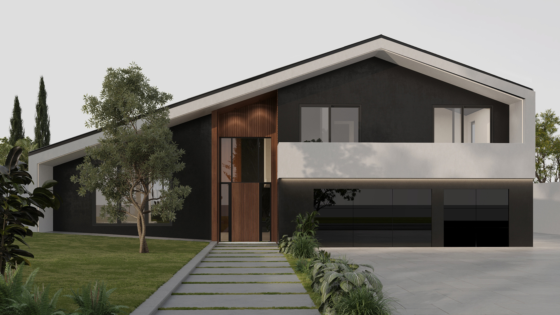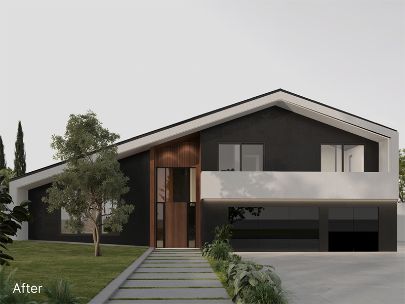 This restoration project aims to preserve the building's original character while infusing it with a contemporary and stylish aesthetic. It has a distinct, sloping roofline that combines materials such as dark stucco and wood cladding, creating a contrast between natural and modern elements.
