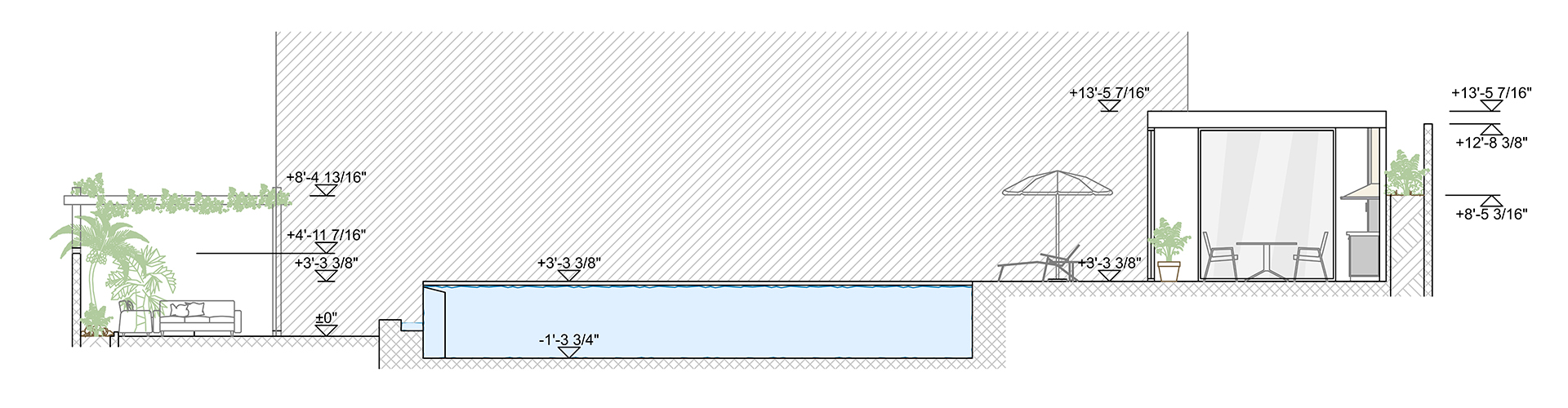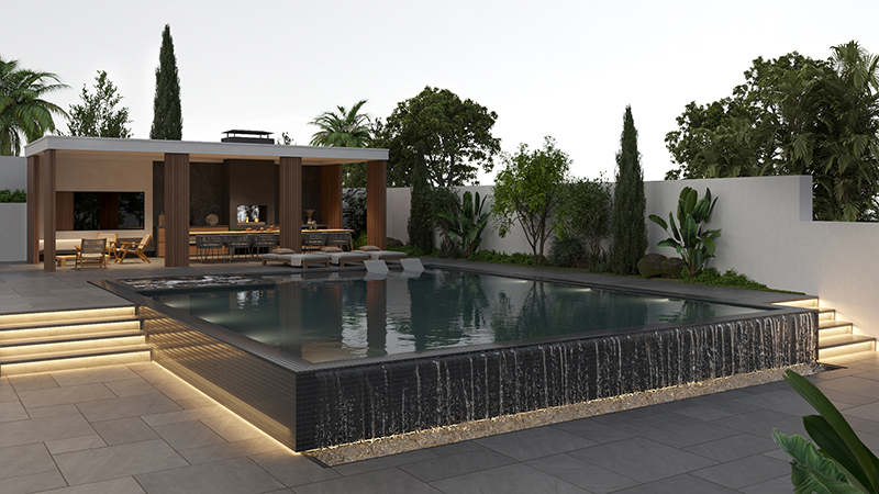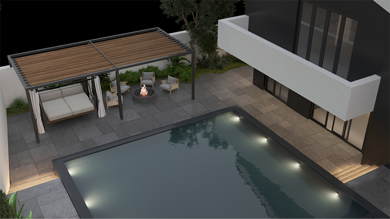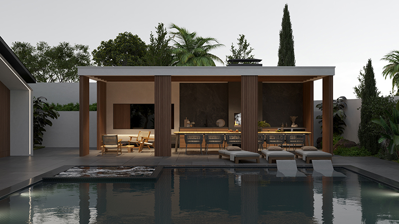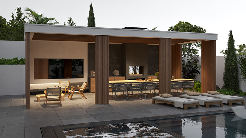 Adjacent to the pool, a spacious outdoor lounge area is sheltered under a flat-roof pavilion designed for entertaining. This space features comfortable seating, a dining area, and an outdoor television framed by lush greenery to evoke a sense of relaxation.