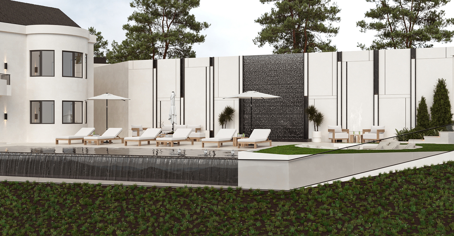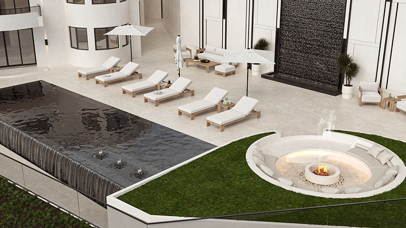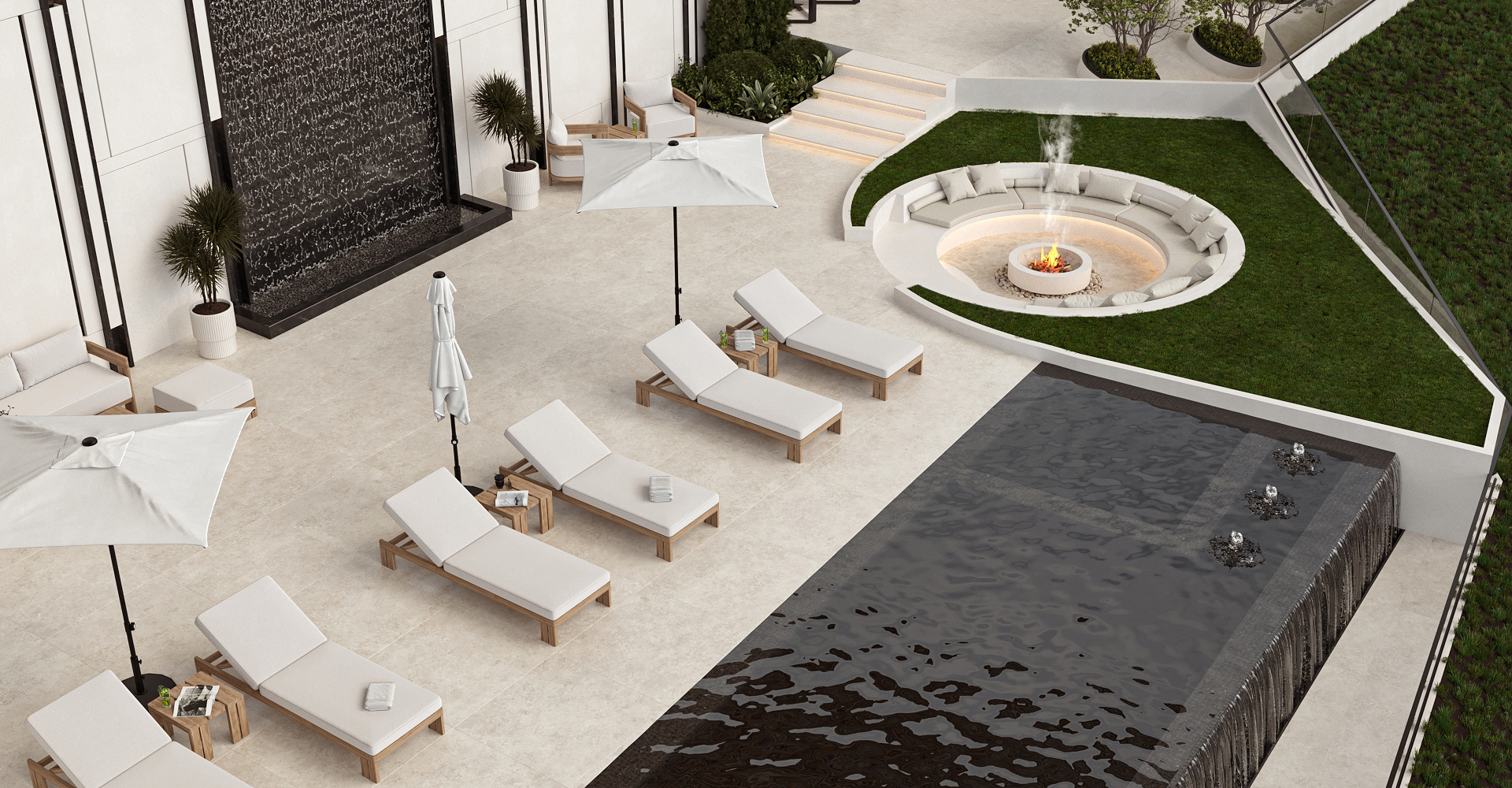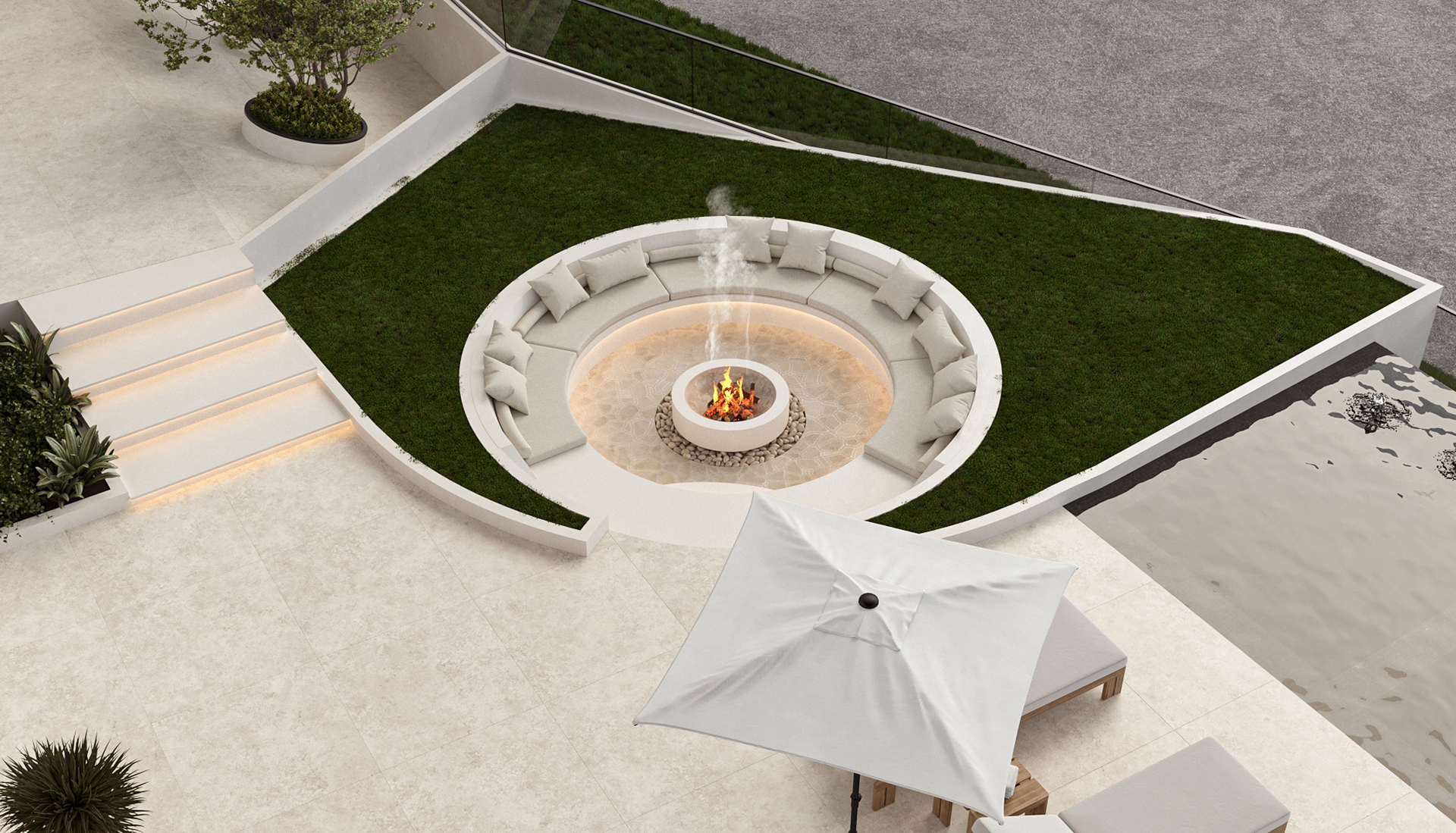 The rear of the house opens onto a resort-style terrace with an infinity pool, sun loungers, and a sunken fire pit lounge, offering a seamless indoor–outdoor living experience. A water feature wall brings a sense of calm, transforming the backyard into a private retreat.