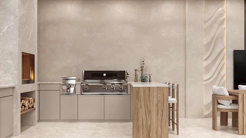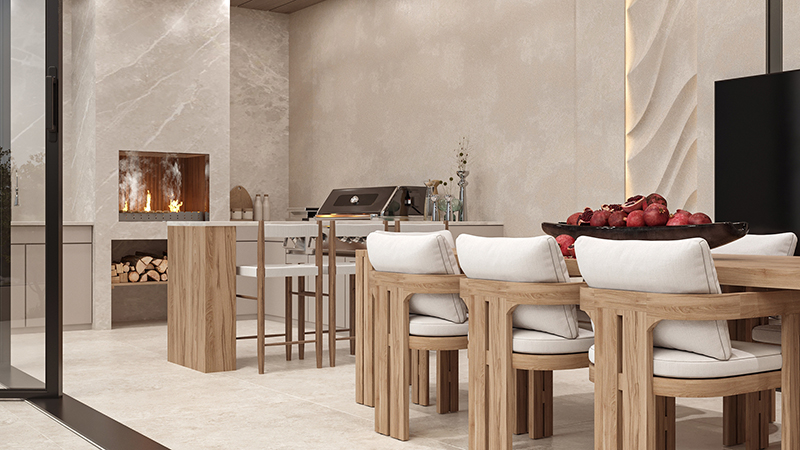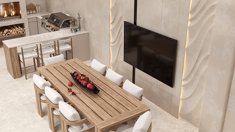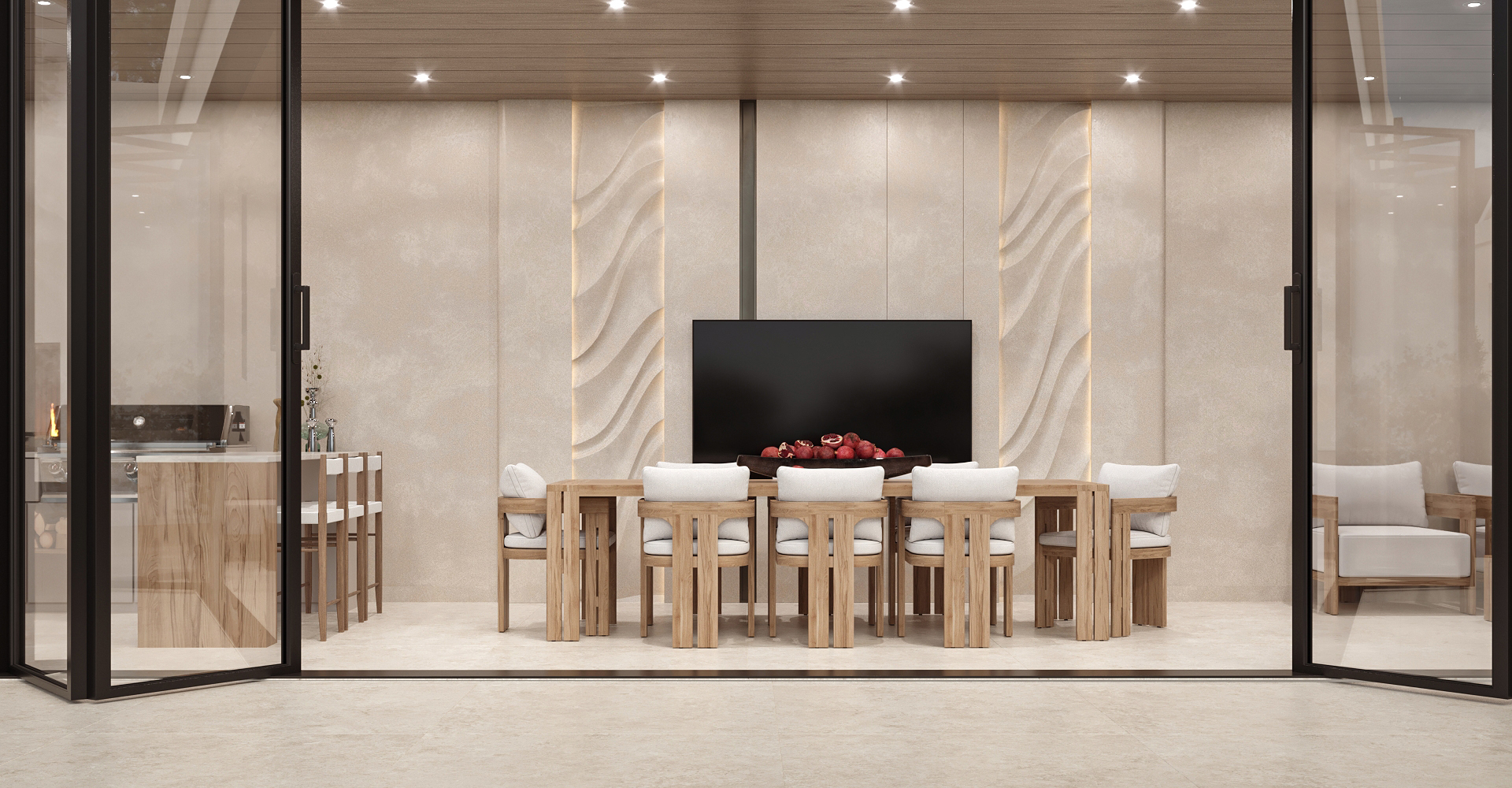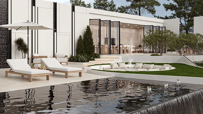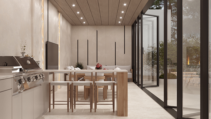 The rear of the house opens onto a resort-style terrace with an infinity pool, sun loungers, and a sunken fire pit lounge, offering a seamless indoor–outdoor living experience. A water feature wall brings a sense of calm, transforming the backyard into a private retreat.