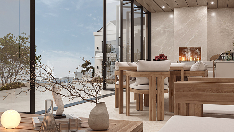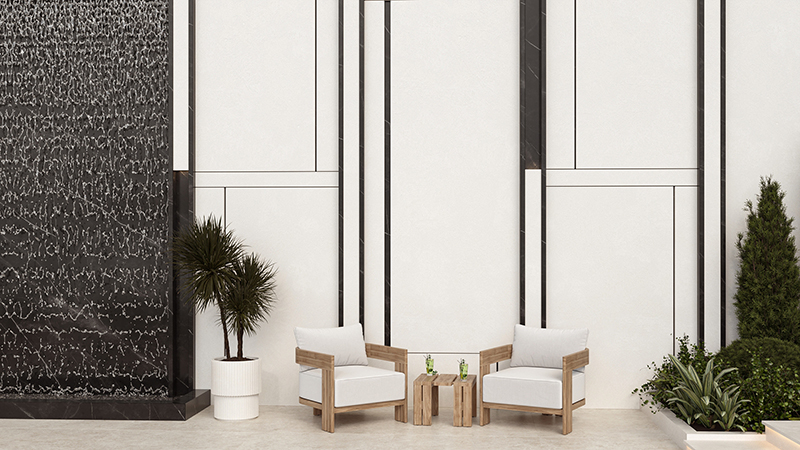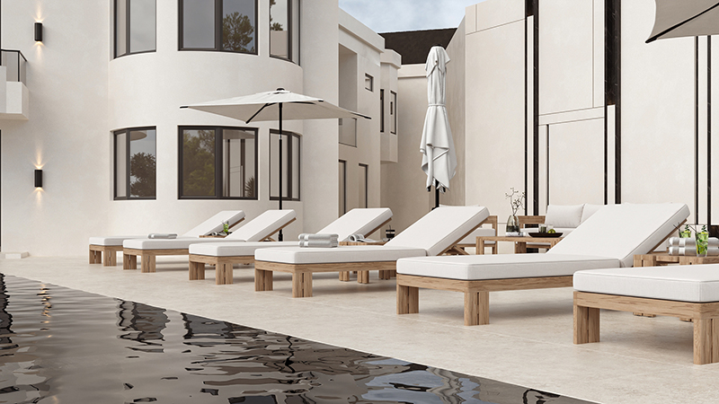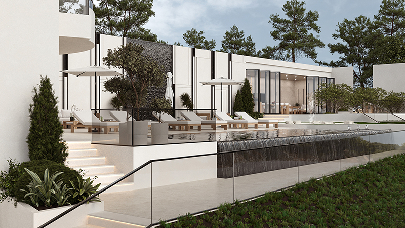 These classic elements are reinterpreted with clean lines, smooth white stucco, and large black-framed windows that flood the interiors with natural light.