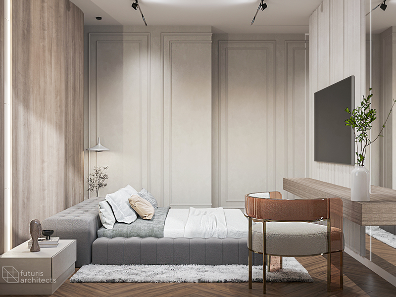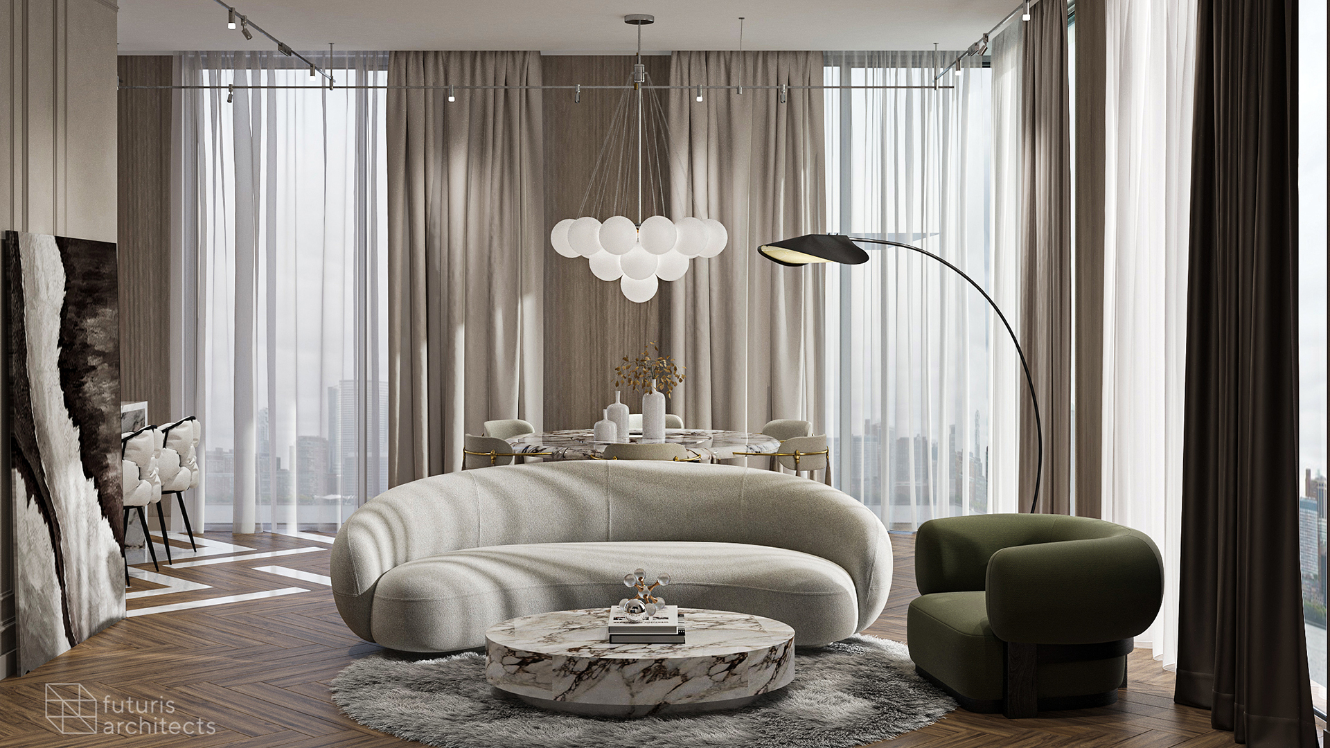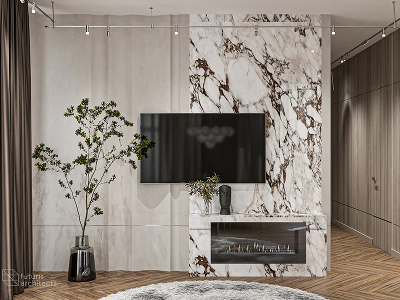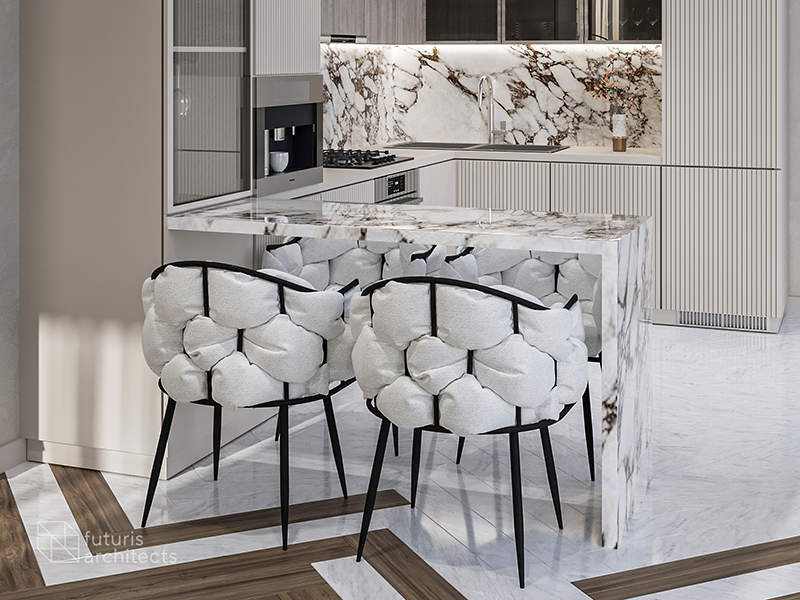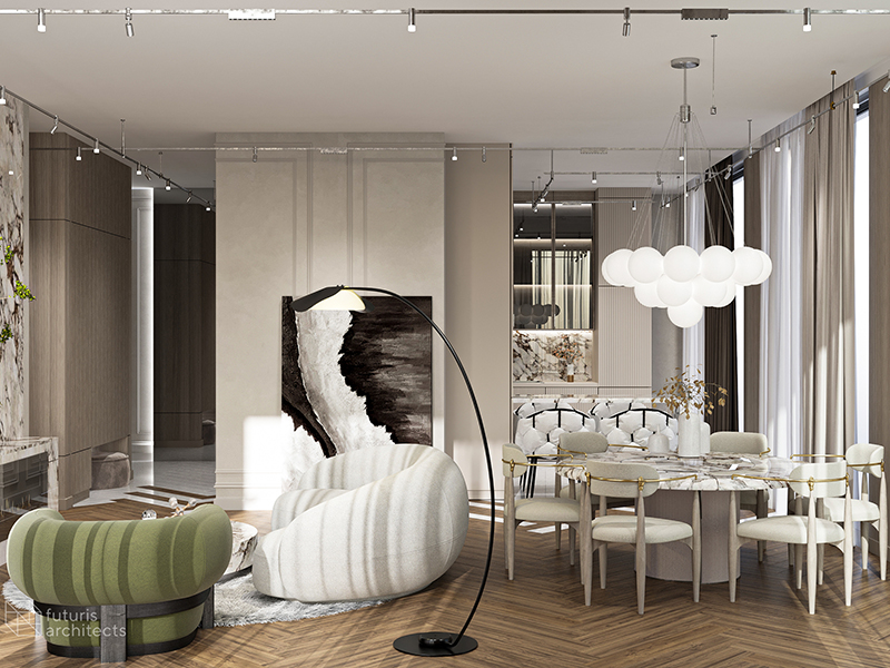 The dining area is both spacious and comfortable, achieved through a combination of colors and furniture. To break up any monotony, we added touches of marble while still maintaining an overall sense of calmness. The open space is cozy and elegant, with various forms of decoration and lighting that enhance the living room's interior.