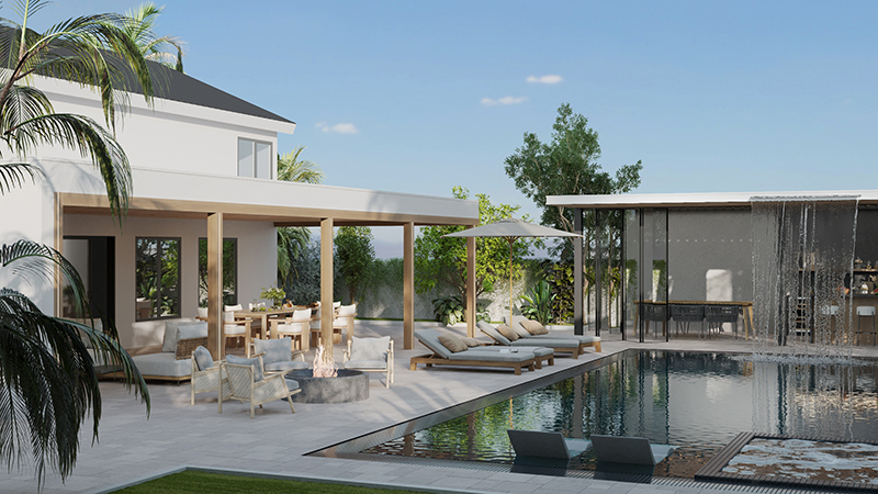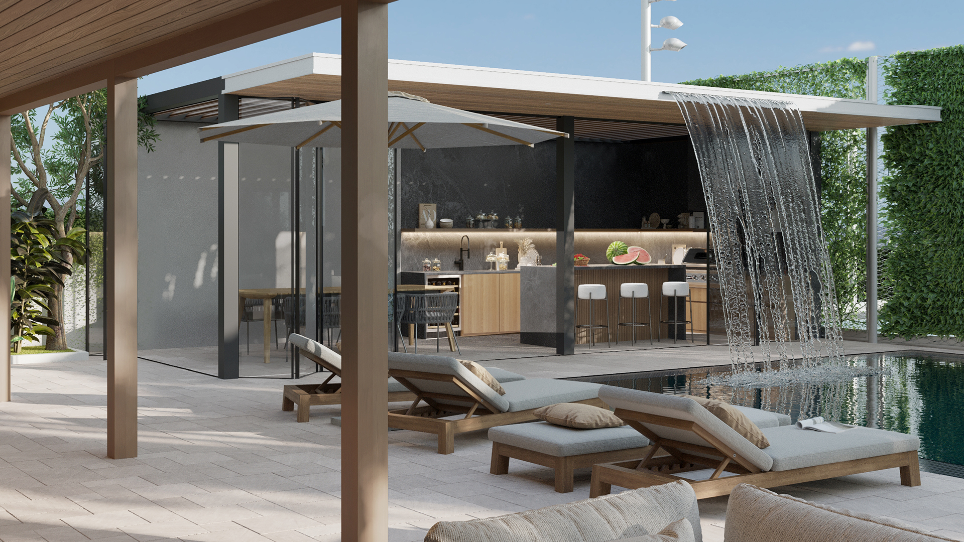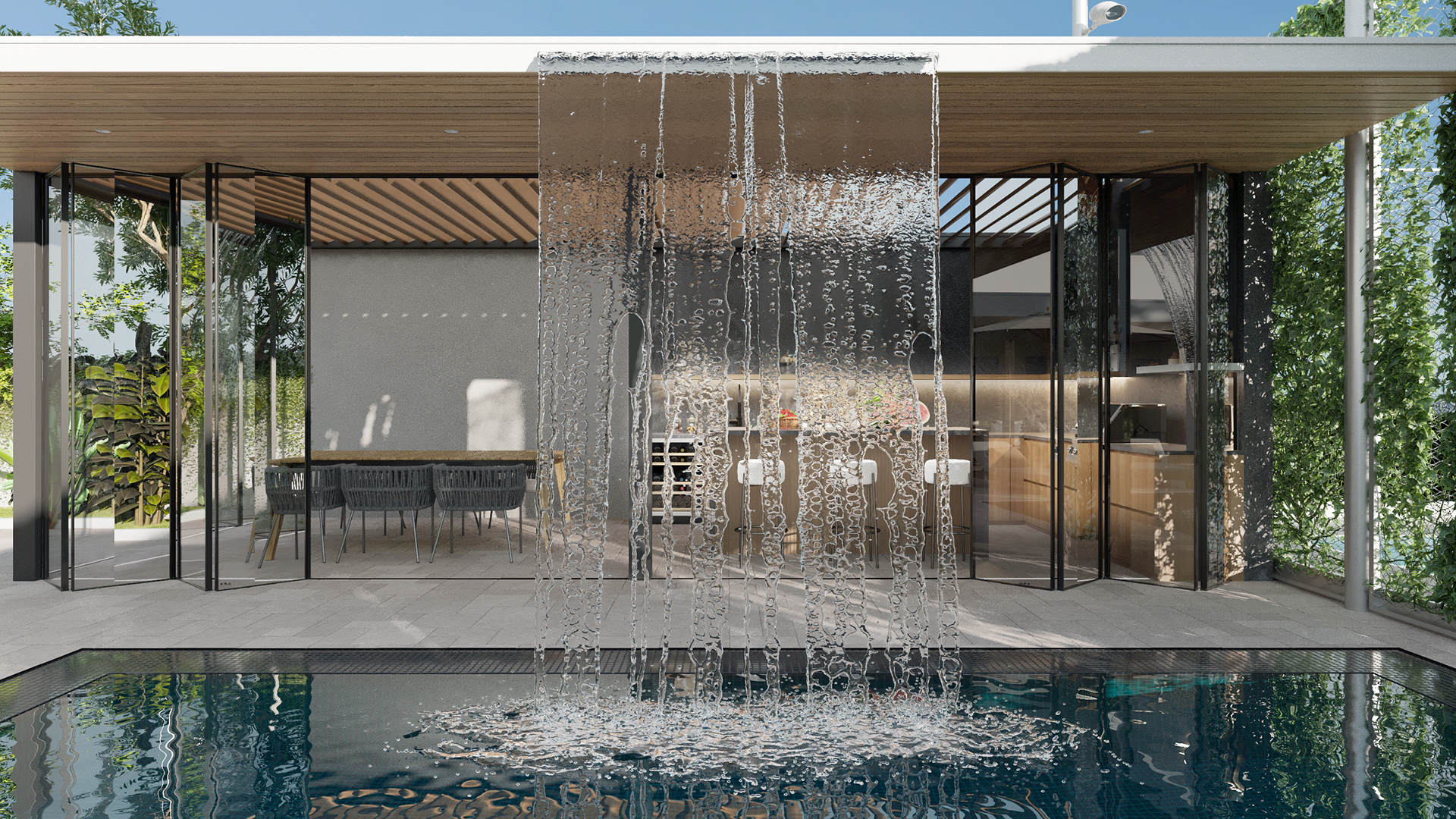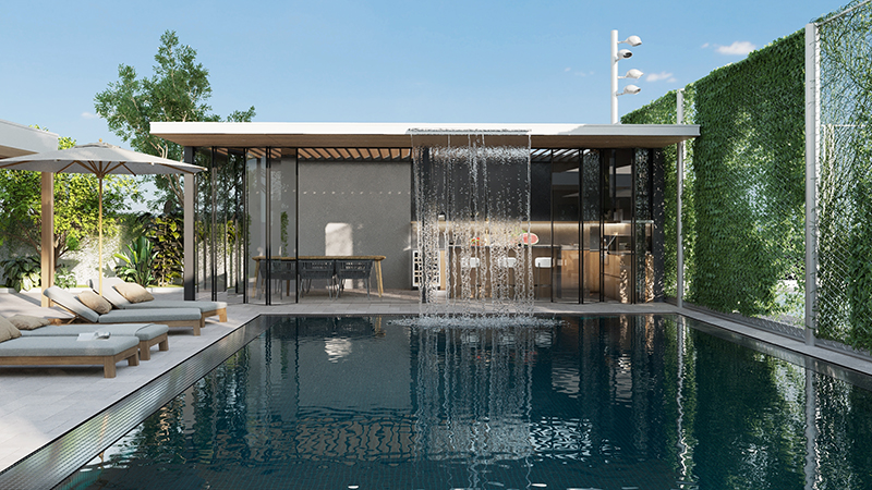 The open layout and large glass walls blur the lines between indoor and outdoor spaces, inviting sunlight, fresh air, and nature into daily life. At its center, the pool area features a waterfall cascading from the summer kitchen's roof, creating a soothing visual and auditory experience that evokes serenity.