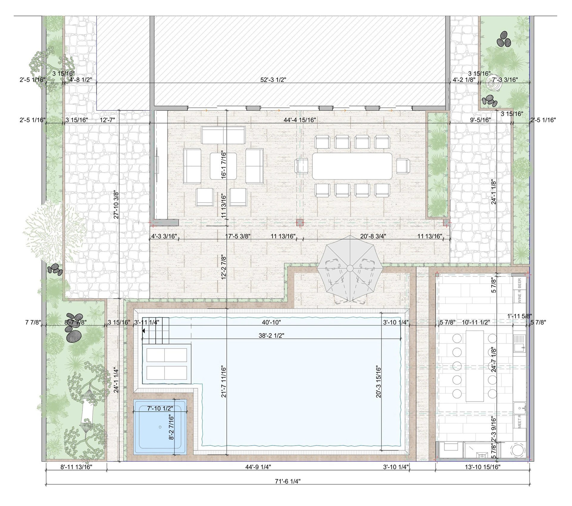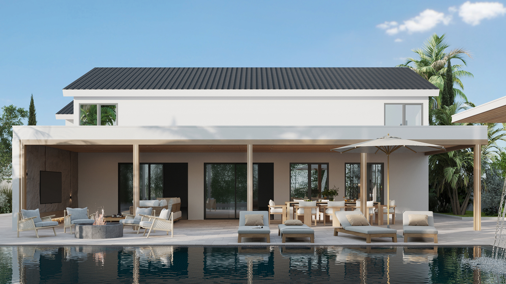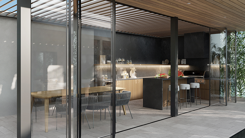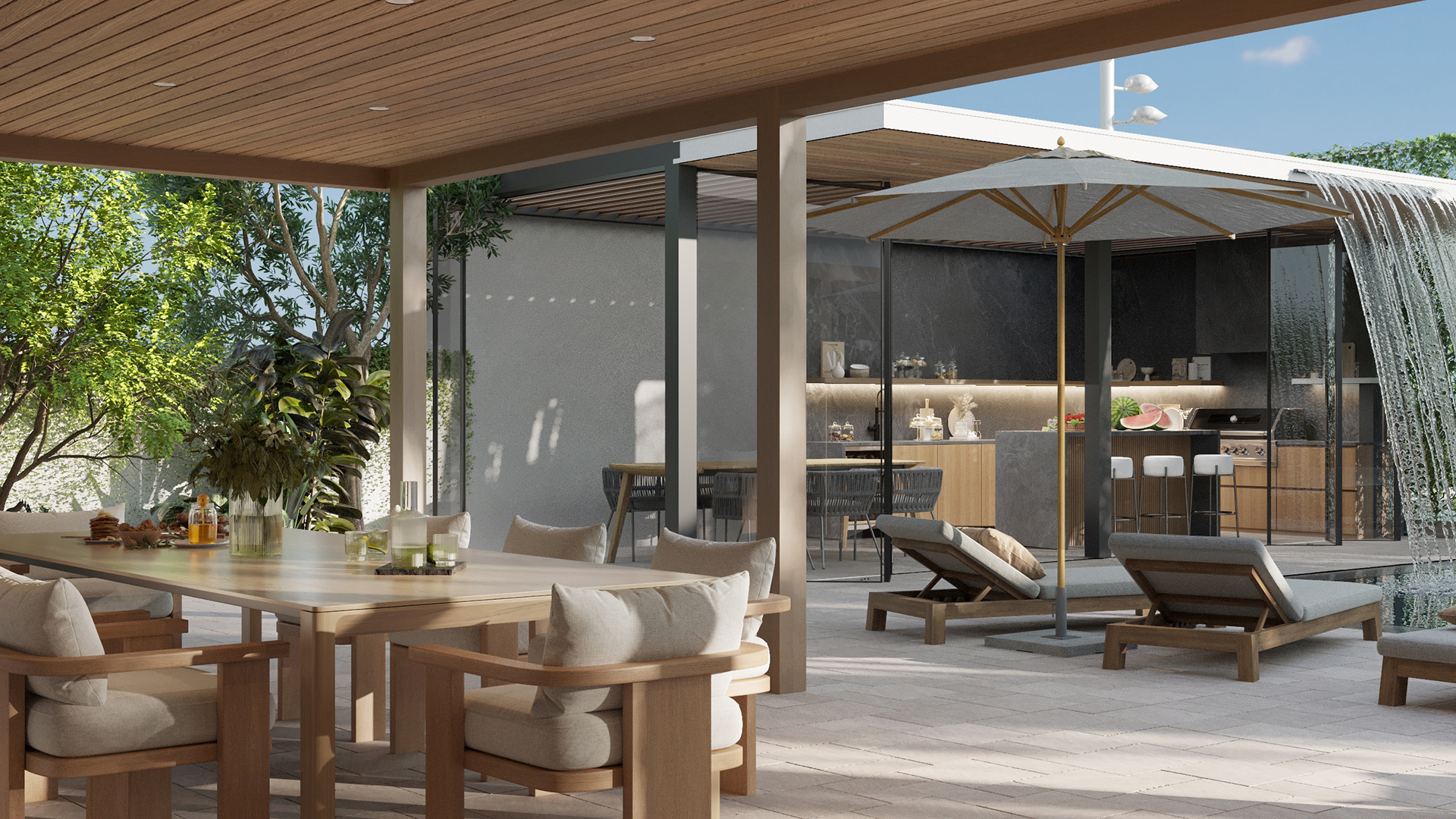 The open layout and large glass walls blur the lines between indoor and outdoor spaces, inviting sunlight, fresh air, and nature into daily life. At its center, the pool area features a waterfall cascading from the summer kitchen's roof, creating a soothing visual and auditory experience that evokes serenity.