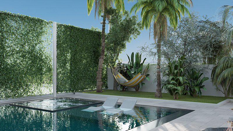 For added privacy and peace, the lush greenery and vine-covered walls create a sanctuary-like atmosphere, cocooning the home in nature and quiet.