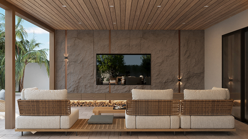 Softly shaded lounge areas with plush, neutral-toned loungers create cozy corners for unwinding, whether soaking up the sun by day or relaxing under the stars by a crackling fire.